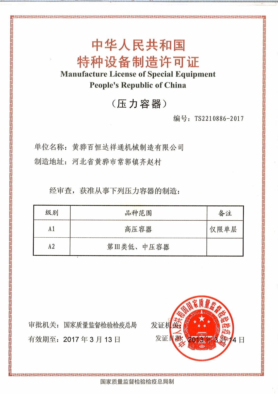 黄骅百恒达祥通机械制造有限公司位于新兴的港口城市黄骅市,于2002年经国家质量监督检验检疫总局批准的特种设备生产企业。公司现具有A2压力容器设计许可证,压力容器A1、A2、D1、D2制造许可证,锅炉B级制造许可证。公司占地面积67320平方米。现有职工285人,其中工程技术人员32人,高级工程师3人,工程师12人,助理工程师6人。资产总值达1.04亿万元,生产50多种工业产品,低温液体储罐(可达250m³)主要市场方向LNG储备,LNG加注站,工业气体分装站,企业和居民气化站、油田加热炉。现阶段的市场方向西北油田,大庆油田,华北油田、各种锅炉产品及各种压力容器产品的市场方向各大化工业、制药业,年产值9800万元左右,近几年通过大胆的改革,在市场经济的大潮中创造了良好的经济效益和社会效益,是目前沧州地区特种设备制造经营的专业企业。 近年来,我公司坚持以“振兴民族工业,创造国际名牌”为己任,坚持“发展是硬道理”,加快企业的技术进步,不断的增加企业的综合实力,在社会各界、各级劳动部门、环保部门、设计院和广大用户的关心和支持下,企业的产品,一直保持着良好的销售势头,锅炉、压力容器产品畅销河北、河南、山东、山西、京津及东北地区,深受用户的信赖。近几年,市场供大于求的趋势加剧,竞争日益激烈,锅炉行业的销售量普遍下降,面对如此激烈的市场形势,我公司坚持发展“以质量求生存,以信誉求发展”的经营方针,使我公司的销售总量以每年平均32%的速度递增。 公司经营管理实行总经理负责制,授权质保工程师独立行使质量监督权力,以及负责全面质量工作,下设设计、工艺、材料、标准化、焊接、检验、水压试验、无损检测和设备九个质量控制系统。每个系统设一名专业质控负责人,严把质量关,使各项工作有依据、有程序、有标准、有见证。由于我们重视产品质量,狠抓质量管理,因此我公司生产的锅炉、压力容器从未出现设计和制造质量事故。先进的技术,精良的设备,严格的管理,也为打造行业品牌奠定了坚实的基础。 “想用户所想,急用户所急”是售后服务部的宗旨,售后服务部由一名工程师负责,并配有精干专业的维修队伍,专用车辆及售后服务专线。优质的售后服务,赢得用户信赖。 重质量,重服务,是公司的追求目标,我们用稳定可靠的产品质量,合理的价位,全天候的售后服务,愿与广大客户真诚合作,共同发展。