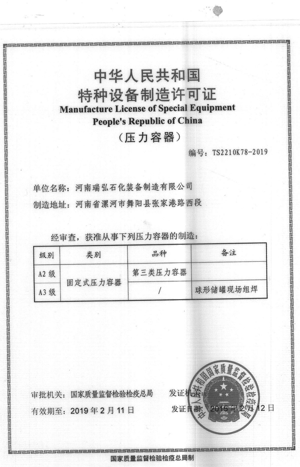 河南瑞弘石化装备制造有限公司是由郑州众信冶金设备有限公司和舞阳恒兴冶金设备修造厂注资创立的拥有集团性质的公司,公司位于河南省漯河市舞阳县张家港路西段,企业注册资金 3000 万,占地面积 40000 多平方米。公司具有国家质量监督检验检疫总局颁发的第三类低、中压压力容器制造(A2 级)、球形储罐现场组焊及球壳板压制(A3 级)制造资质,并通过了方圆标志认证集团 ISO9001 质量管理体系、ISO 14001环境管理体系和 OHSAS 18001 职业健康安全管理体系及中石油、中石化健康、安全与环境管理体系(HSE)认证。