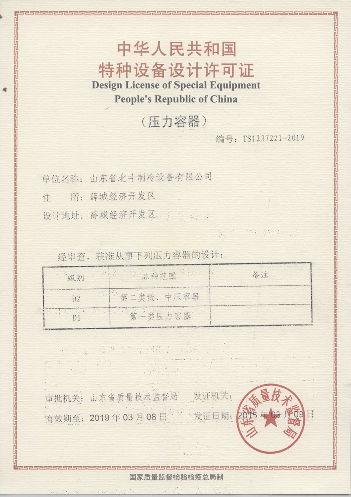 公司在国内制冷空调行业率先取得了全国工业产品生产许可证,并率先通过了ISO9001质量管理体系认证、ISO14001 环境管理体系认证、OHSA18001职业健康安全管理体系认证;取得了中华人民共和国特种设备制造许可证(压力容器D1、D2类)、特种设备设计许可证(压力容器D1、D2类)、特种设备安装改造维修许可证(压力管道GC2级);我北斗公司注册的“薛风”商标荣获山东省著名商标,产品被国家机械工业局评定为一等奖。是中国制冷学会、山东省制冷学会、新疆制冷学会、中国风机协会、中国氯碱协会等会员单位。