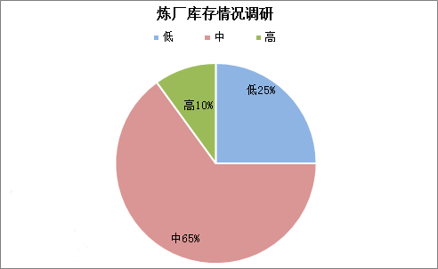 对国内炼厂石油焦库存情况进行调研发现,目前各炼厂仍是以中位库存为主,占调研总数的65%左右;低库存厂家数量仅占到总数的25%左右;库存高位的厂家在10%左右,详见图1。