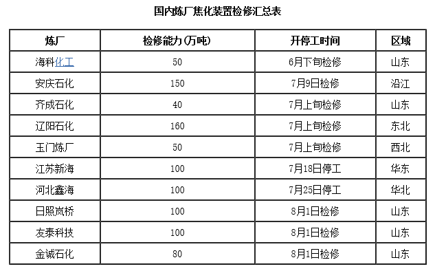 由上表可以看出,在经历过6-7月份的检修高峰期后,8月份地炼将以开工为主要趋势。而主营单位则表现为检修继续增加趋势,石油焦供应量将出现分化局面,不过这将有利于地炼与主营单位市场回归统一性。