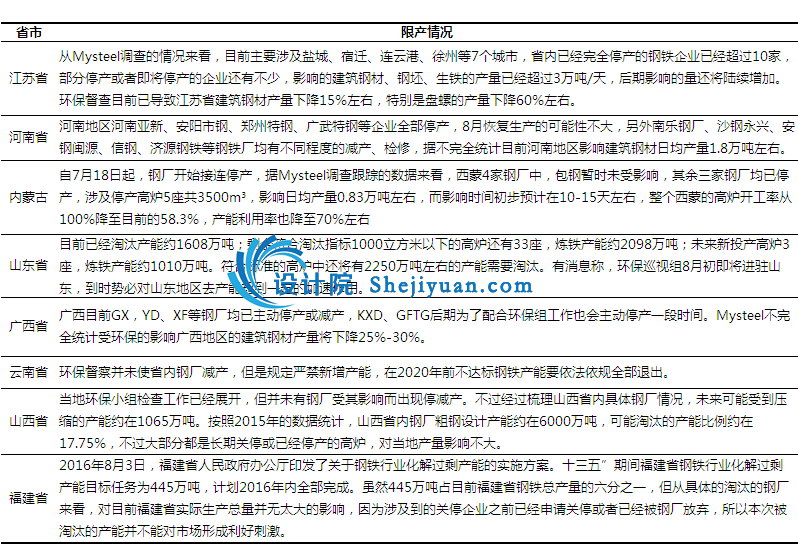 受近期环保升级以及8月底9月初杭州G20峰会临近的影响,钢厂限产规模扩大,对钢材供给方面产生重要影响,具体来看: