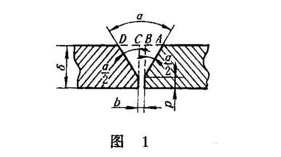 如图1所示带钝边V形坡口焊缝,坡口角度为α,间隙为b,钝边为P,根据解三角形的方法:
