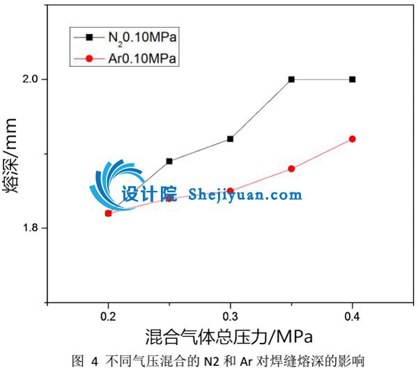 混合气体九组试验对应的熔深如图 4 所示。从图中可以看出焊缝的熔深随着混合气体压力的增 大而增大;此外,当混合气体压力相同时,N2 所占的气体压力比例越大,焊缝的熔深越大。这与单 一种类气体作为保护气体的原理相同,气体压力大,气体流量就大,大流量的保护气体去除了熔池 上方的一部分光致等离子体,减轻了光致等离子体的屏蔽作用,因此熔深增大。N2 的等离子体的维 持阈值高于 Ar 的等离子体的维持阈值,所以在 N2/Ar 混合气体中 N2 的比例越大,熔深越大。