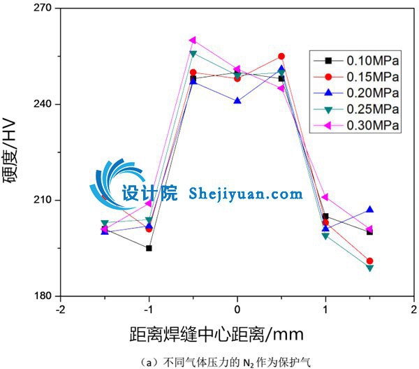 使用不同气体压力的 N2 作为保护气体的焊件显微硬度如图 7(a)、(b)所示,从图中可以看出 保护气体的压力和类型对焊缝的硬度没有影响;无论使用何种保护气体,焊缝的硬度大于母材的硬度。