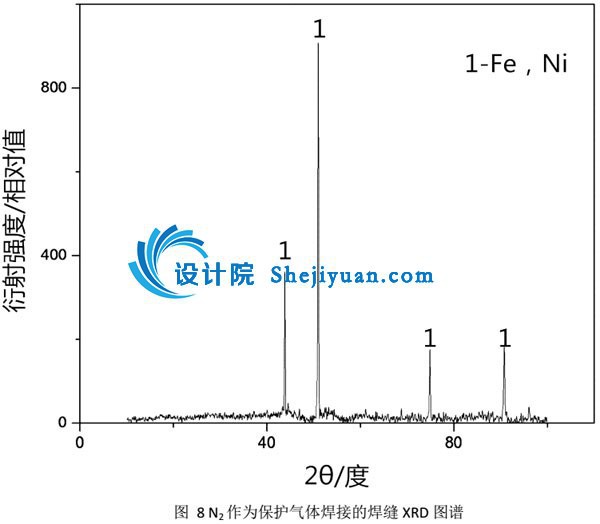 氮气是一种分子气体,它不会与不锈钢发生化学反应,但氮气容易和空气中的氧气化合成为一 氧化氮(NO)而进入熔池中,使焊缝金属变脆。保护气体对焊缝的硬度没有显著影响可能是因为 N2 没有进入熔池。图 8 是使用 N2 作为保护气体焊接的焊缝的 XRD 衍射图谱。通过 MDI Jade 软件分 析,焊缝中没有氮的化合物,焊缝物质为铁镍合金。由于 N2 没有进入焊缝中,保护气体对焊缝的硬 度没有明显影响。