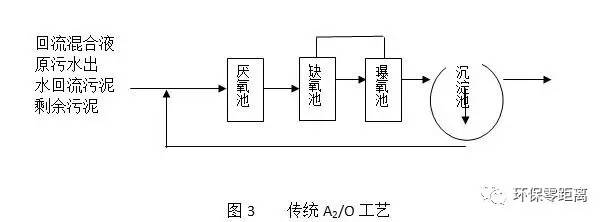 A2- O 法处理工艺是在好氧条件下,污水中NH3和铵盐在硝化菌的作用下被氧化成NO2-—N和NO3-—N,然后在缺氧条件下,通过反硝化反应将NO2-—N和NO3-—N还原成N2,达到脱氮的目的。A2/O是目前普遍采用的工艺,它是在法A/O法的基础上增加一个厌氧段和一个缺氧段,传统A2/O工艺流程如图3所示。