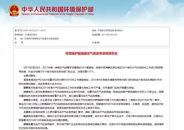 2月19日至20日,2017年第一季度空气质量专项督查的18个督查组,继续对京津冀及周边地区18个城市大气污染防治工作进行现场督导检查,共走访检查370个地方政府及相关部门和企业,发现问题137个。
