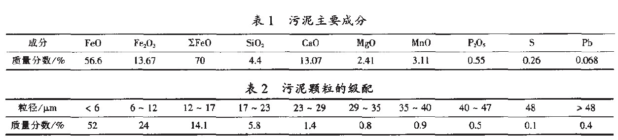 三钢的污泥成分及颗粒级配见表1、表2。